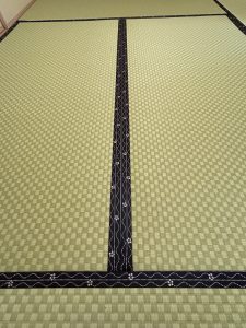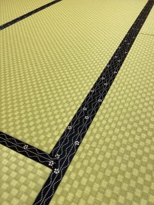 畳縁は縞と梅の縁で色合いが市松畳とよく合い模様が引き立ち、落ち着いた雰囲気を演出しました。